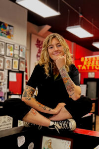 Claud enjoys continuing to practice in all styles, but her favorites are American traditional, botanical, and color work. Claud pours her heart into all that she does, and creates a calm and safe environment when tattooing. She would love to work with you and bring your idea to life! Her hobbies outside of tattooing include maintaining her live-aboard sailboat, swimming with sharks, dancing at raves, hiking with her dog Winnie, and baking cookies.