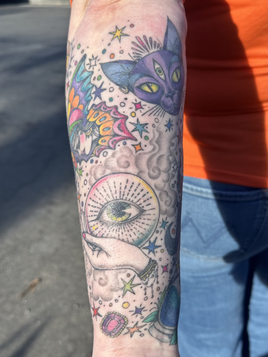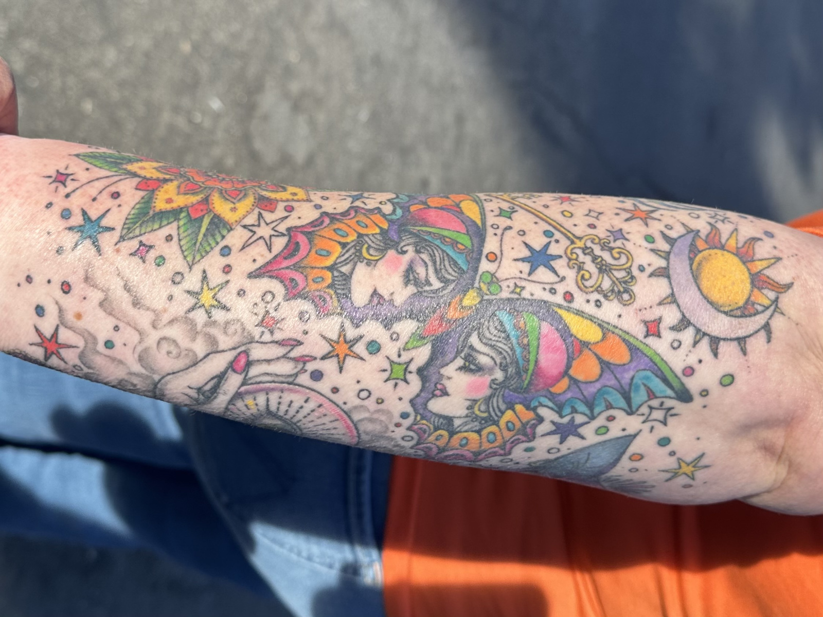Natasha’s apprenticeship and the six years that followed were all spent at Sacred Rose Tattoo in Berkeley. After that, she opened a shop in San Mateo California, Sugarfoot Tattoo, which she owned and operated for 10 years. After Covid hit, for the last six years, she enjoyed working out of a private studio, but now she’s back! Working at Sacred Rose Berkeley again, and versed in most styles of tattooing. Come by and have a chat with her if you’d like to know more!