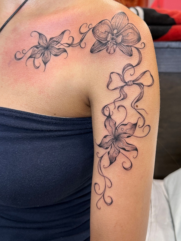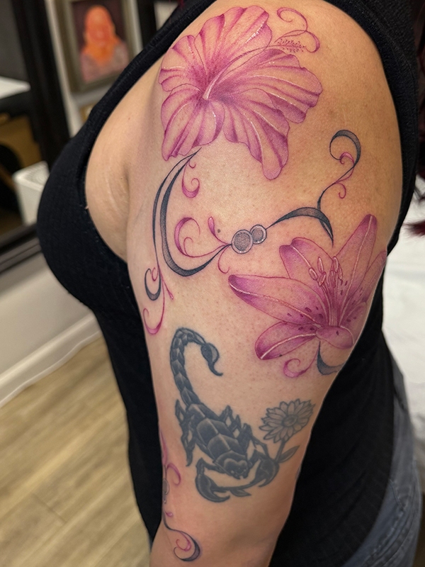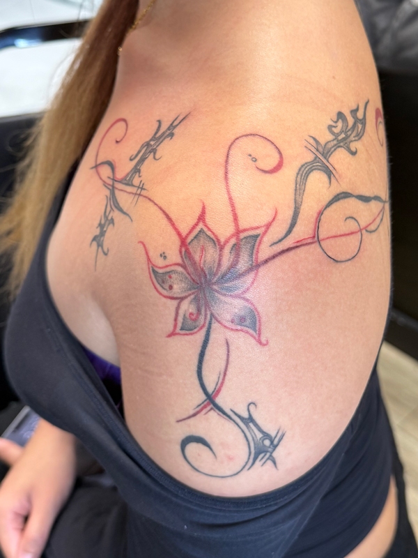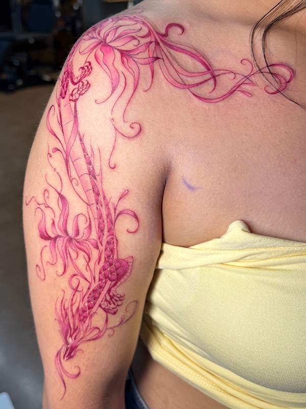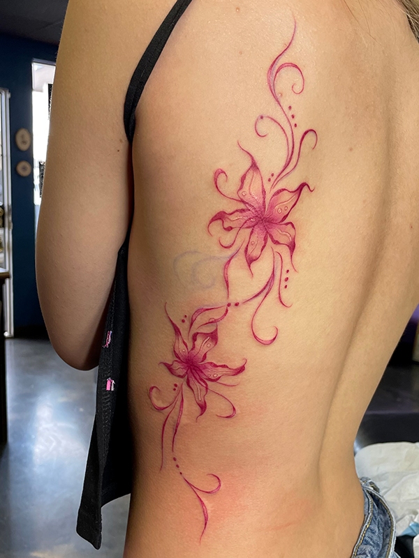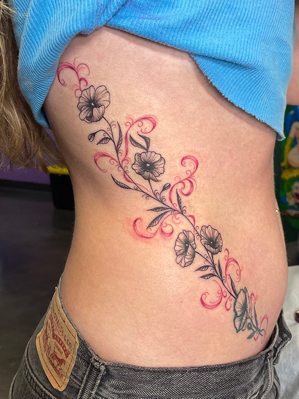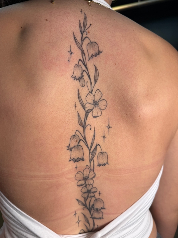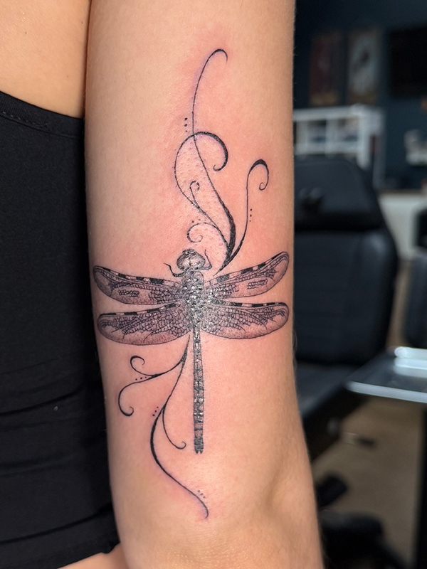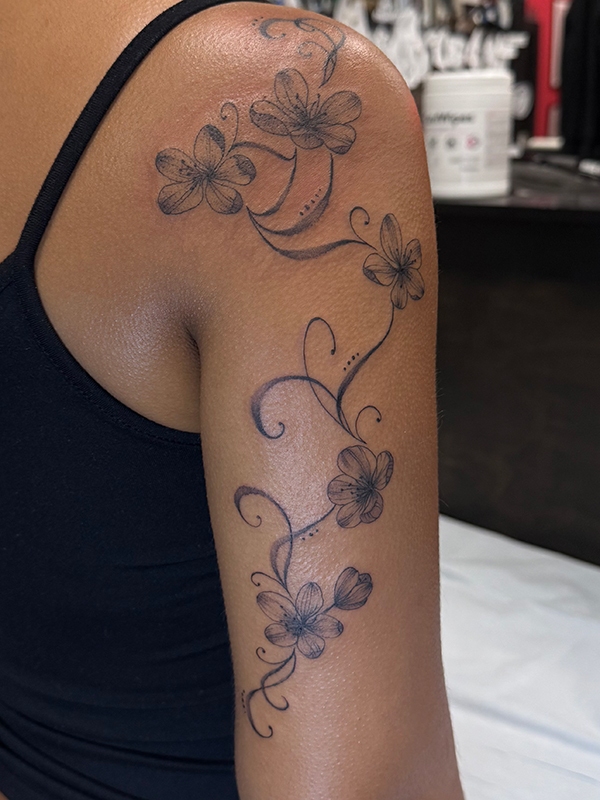 While she enjoys working in all tattoo styles, Rachel’s specialties include fineline, botanical designs, color work, and freehand creations. She loves creating tattoos that flow naturally with the body’s shape, making each piece truly one-of-a-kind. Her freehand approach allows her to work directly with the natural lines and movement of the skin, resulting in tattoos that feel like they were always meant to be there.