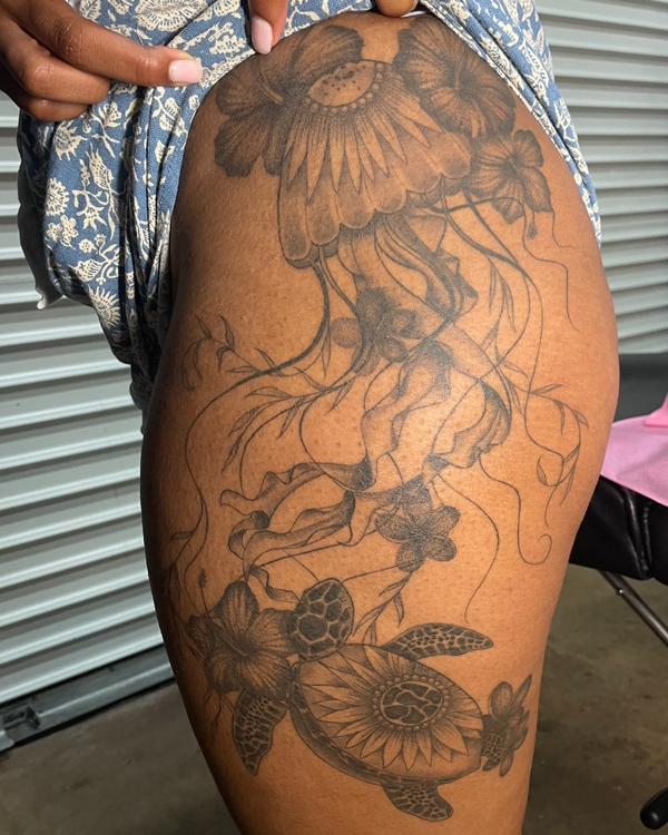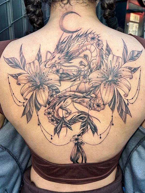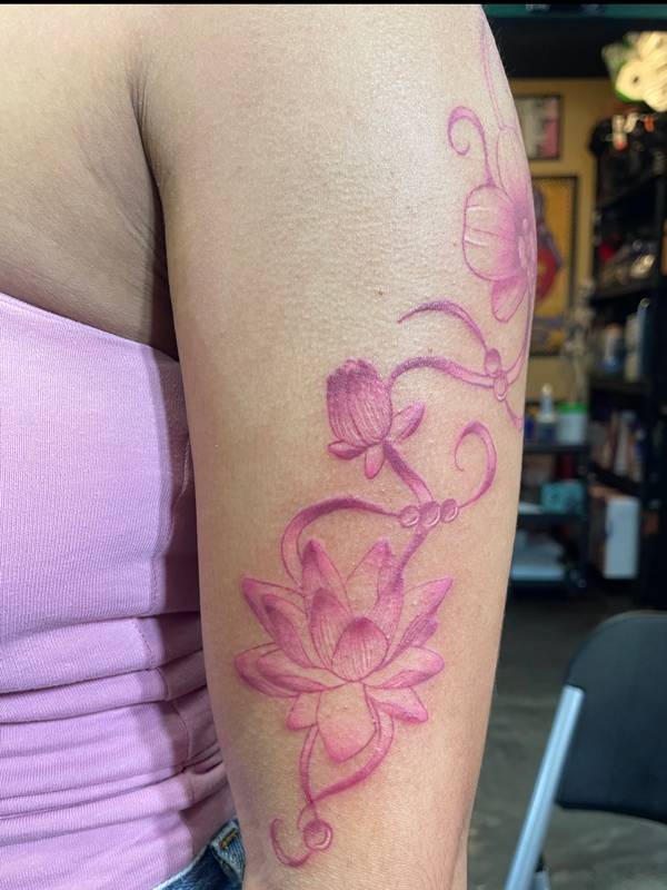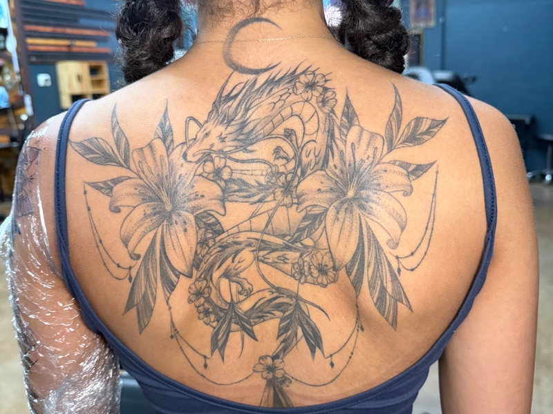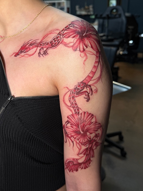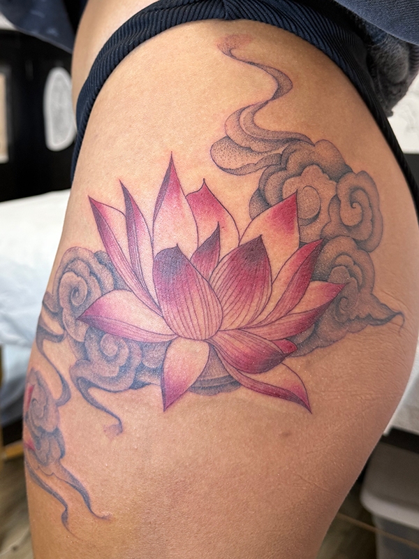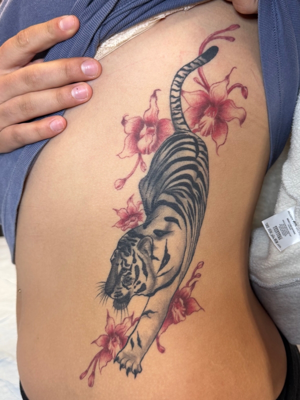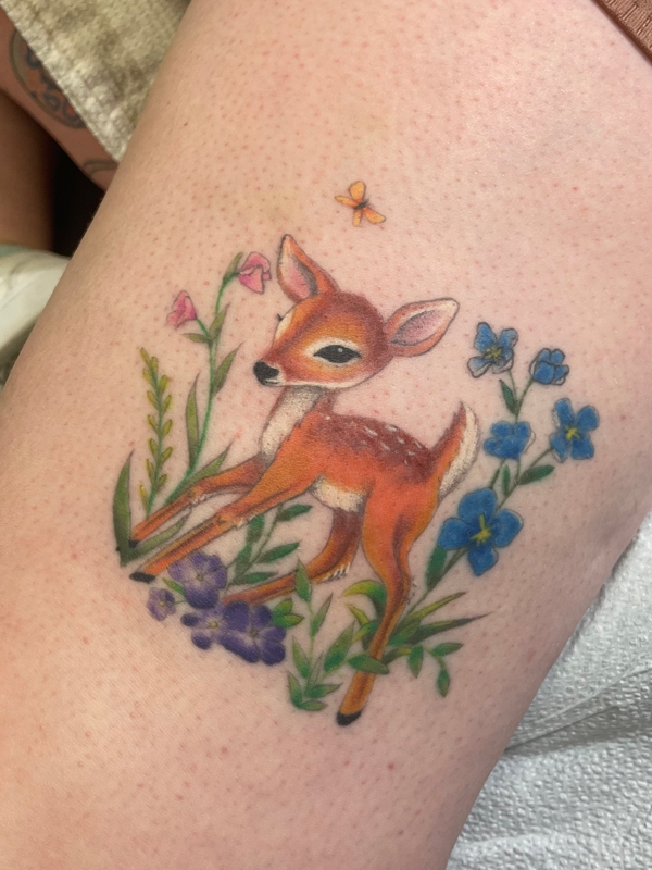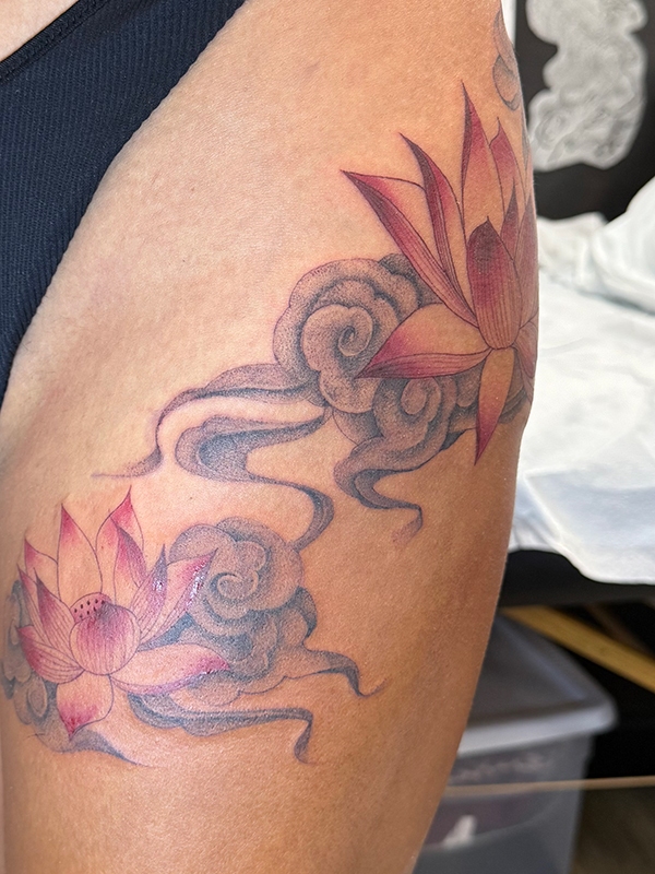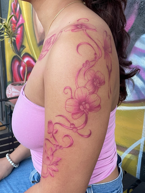 While she enjoys working in all tattoo styles, Rachel’s specialties include fineline, botanical designs, color work, and freehand creations. She loves creating tattoos that flow naturally with the body’s shape, making each piece truly one-of-a-kind. Her freehand approach allows her to work directly with the natural lines and movement of the skin, resulting in tattoos that feel like they were always meant to be there.