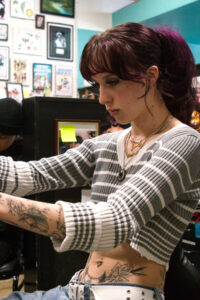 Rachel has been making things for as long as she can remember—drawing, sculpting, painting, sewing clothes, crafting… Basically, if it involves creating, she has tried it. In 2023, she took that love for art into the tattoo world, and she has been tattooing professionally ever since.